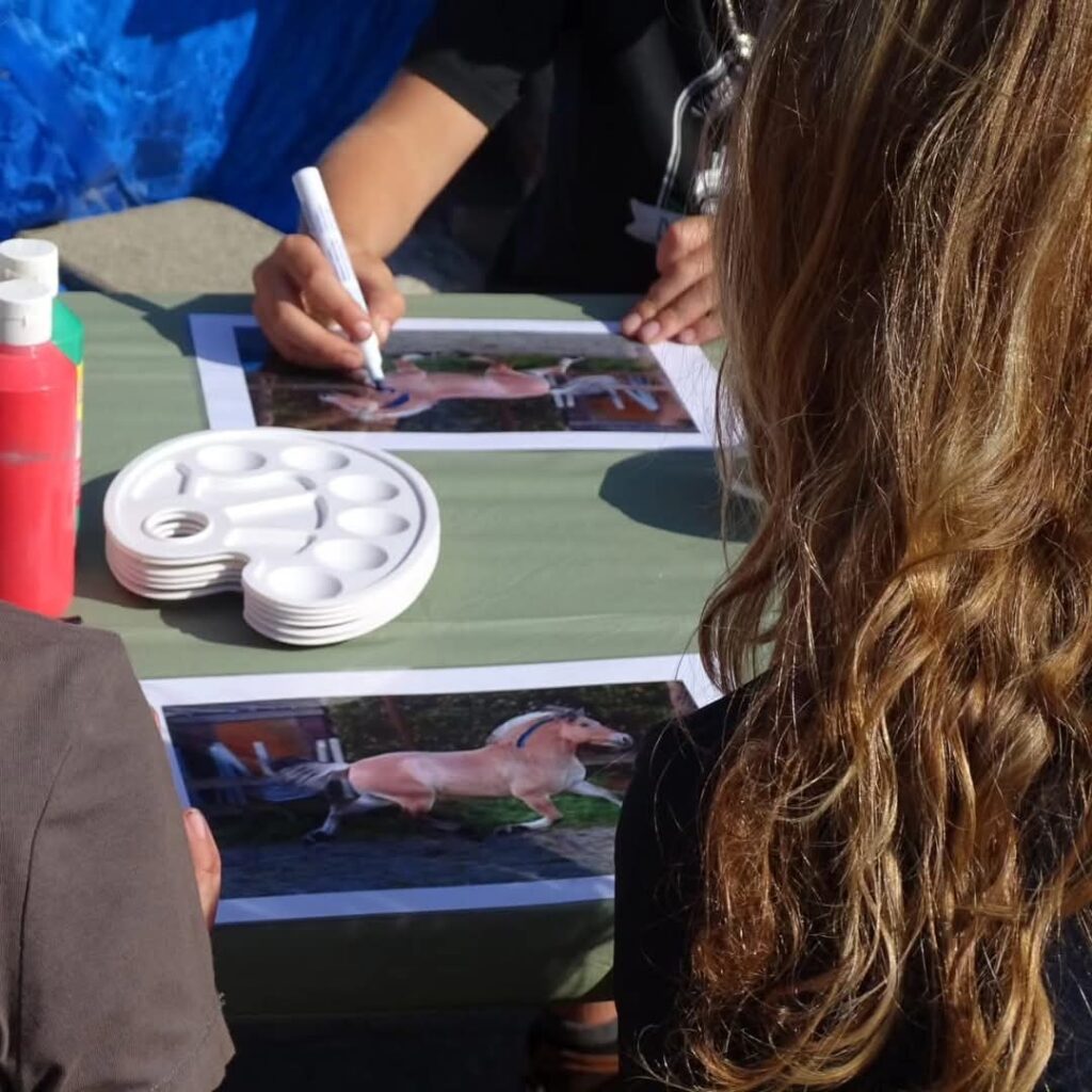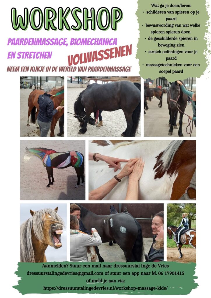 Jong geleerd, oud gedaan. Een superleuke workshop waarin kinderen spelenderwijs kennismaken met het skelet en de spieren van de pony. Deze worden op de pony geschilderd. Daarna zetten we de pony aan het werk en kijken we hoe de spieren bewegen. Ook leren de kinderen hoe ze een pony soepel kunnen houden, door laagdrempelige massagetechnieken en stretchoefeningen te leren.